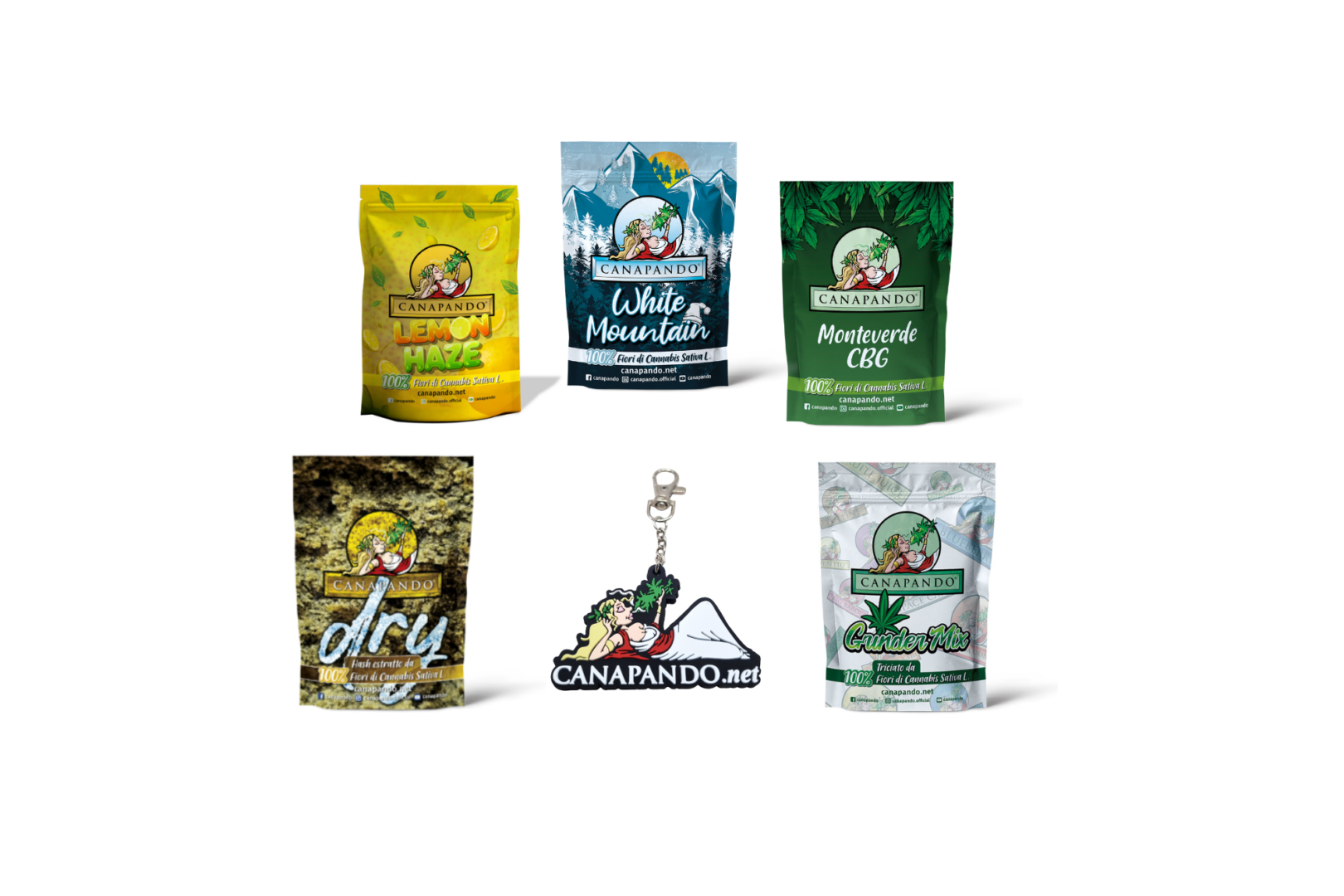1g Dry - 1g Lemon Haze - 1g Monteverde CBG - 1g White Mountain - 3,5g Grinder Mix - 1 Porta chiavi Canapando